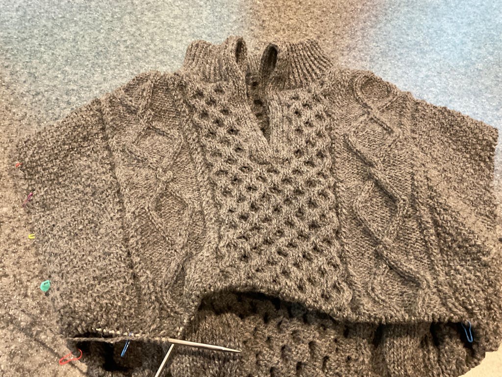I am knitting de Dagmar zipper sweater (Petiteknit) with Briggs and Little Heritage medium grey and absolutely loving it! My gauge was perfect for this sweater pattern, nice and consistent Aran weight, and the cables and moss stitch look amazing. After I blocked the swatch I could not believe how the yarn bloomed into soft, heathery, rustic beauty… and very affordable! Will definitely buy it again for other cable sweaters.
