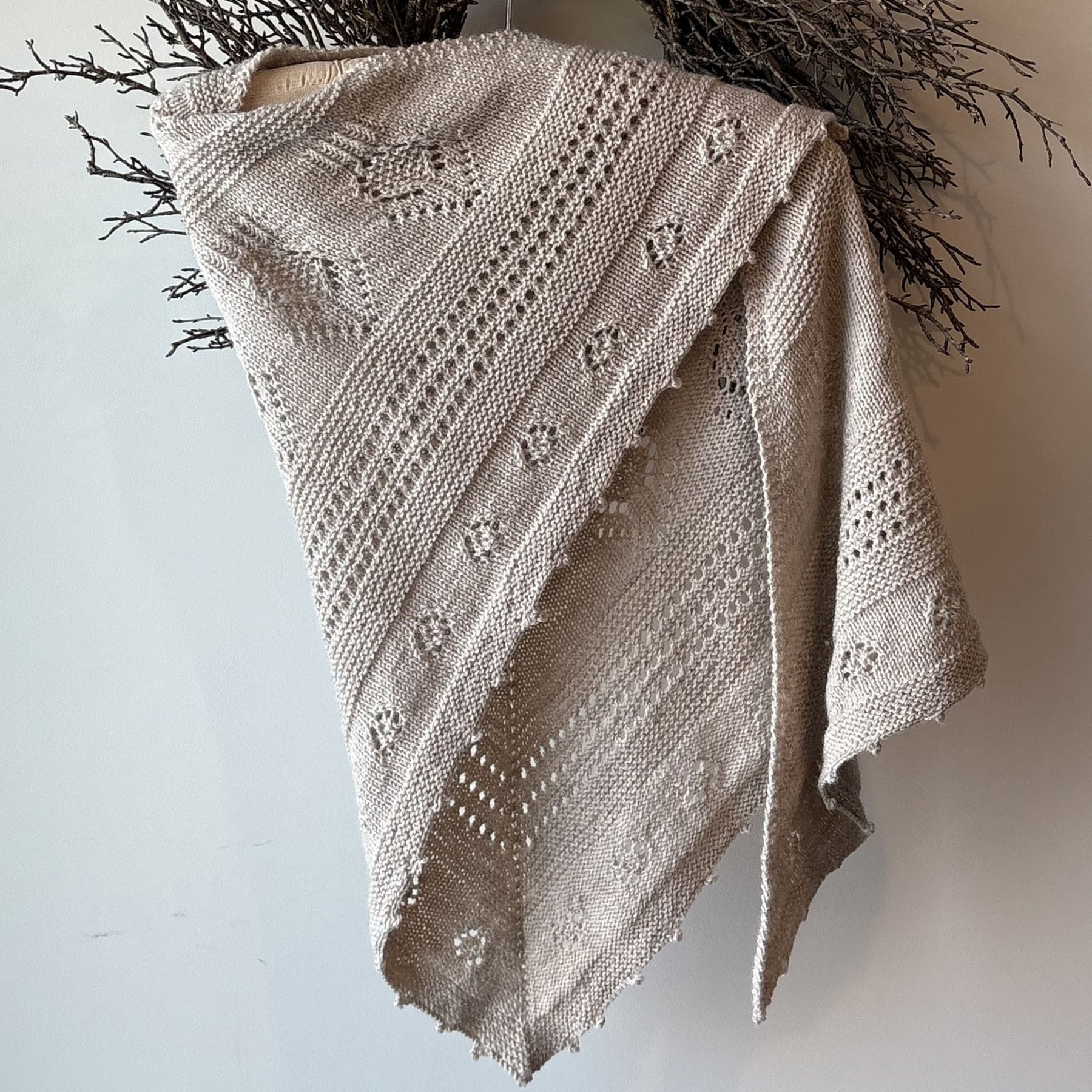 The Thistle on the Moor Shawl by Carolyn Holbrook is a graceful triangular wrap inspired by wild Scottish landscapes and native blooms. Beginning with a garter tab and growing through sections of floral lace, including delicate thistles and woodland flowers, the design balances engaging stitch patterns with restful garter rows, making it a rewarding and rhythmic knit.