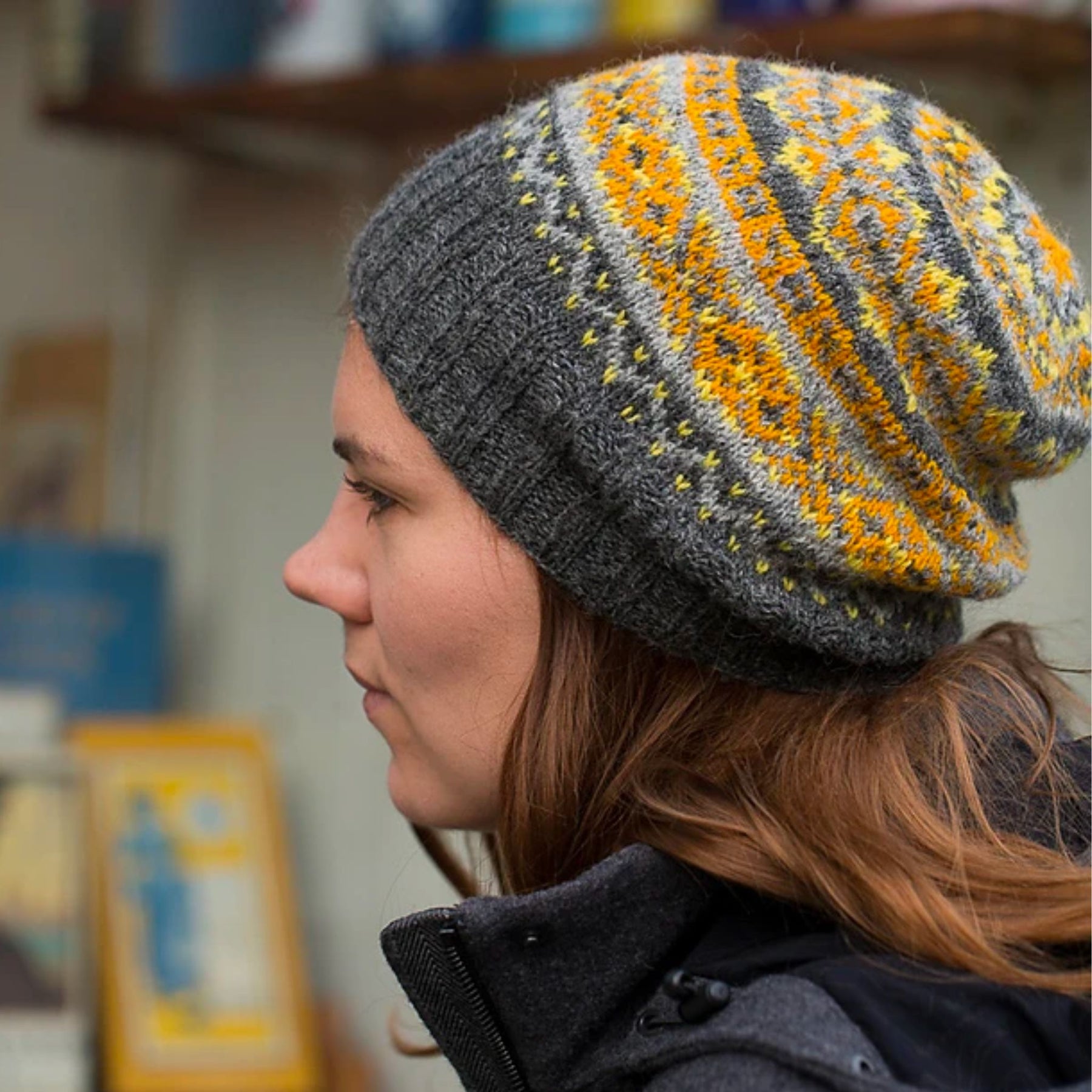 The Saudade by Ysolda Teauge is a slightly slouchy beanie design knit with Jamieson & Smith 2ply Jumper Weight Yarn. With this yarn set, you can enjoy knitting Fair Isle colorwork with one of our favorite 100% Shetland Wool yarns. The way the greys and yellows come together in this design is just magic and such a fun way to play with colors!